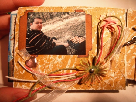 дальше из недр родины был добыт лист коричневой бумаги - в лихие 90-е была такая цветная бумага - ее печатали на обратной стороне фотообоев ( может помнит кто - переворачиваешь а там фигня какая-то нарисована). дальше я начала пробывать делать все. все что не делала до этого и начала. цветочки училась лепить, шнур этот заворачивать, подложки под фотки.